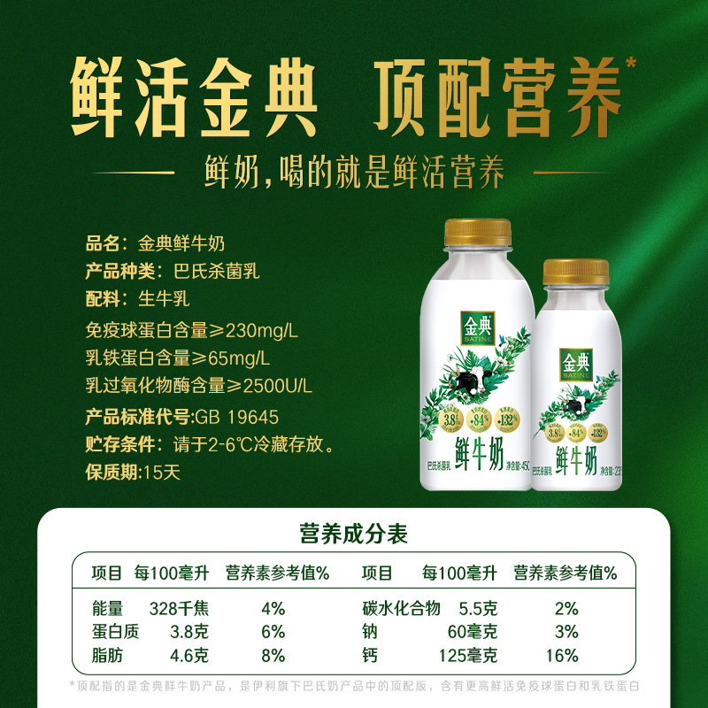 伊利金典巴氏杀菌鲜牛奶235ml*8瓶+高钙小黄瓶鲜牛奶235ml*4瓶