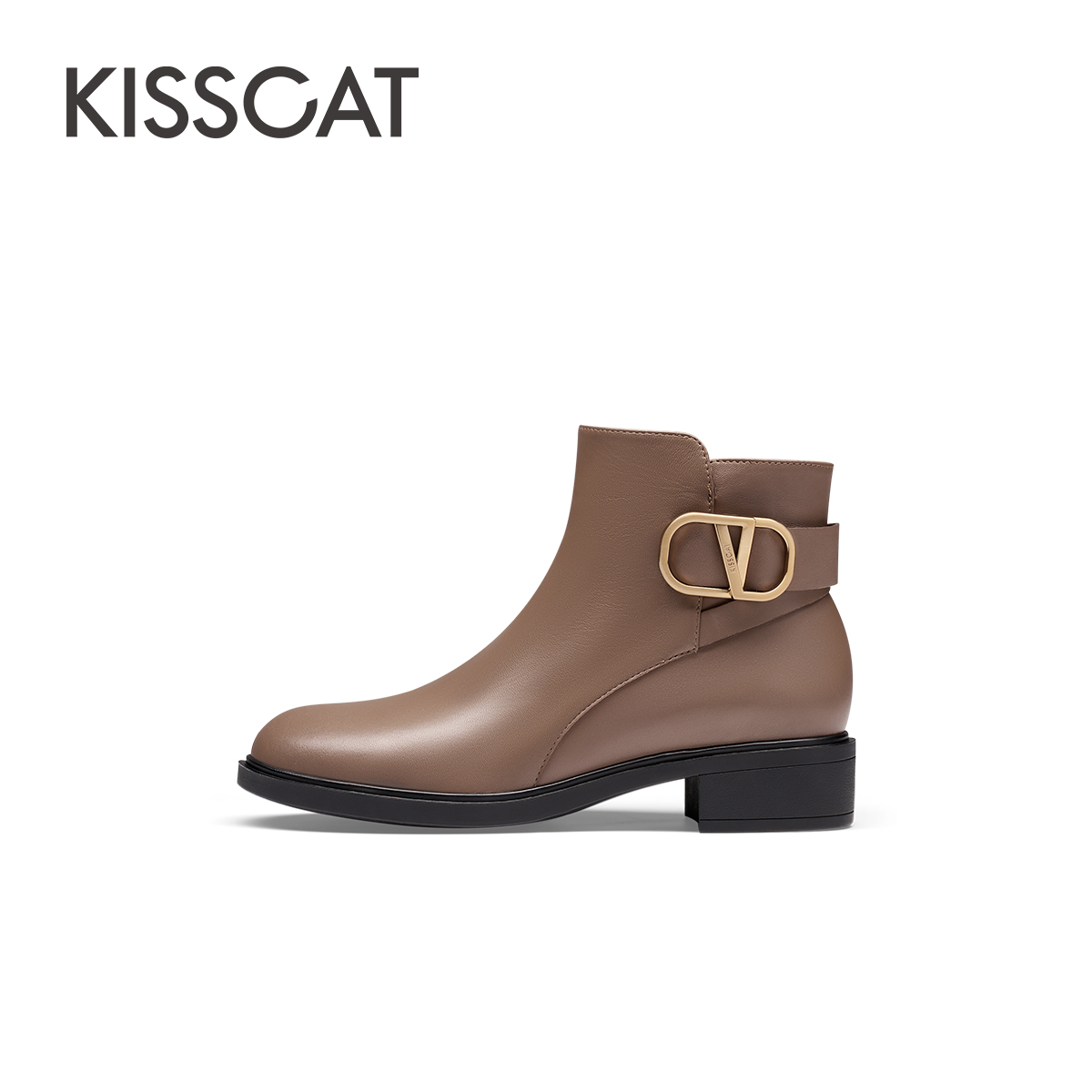 接吻猫秋季新款通勤亲肤羊皮加绒短靴舒适增高中粗跟时装靴女