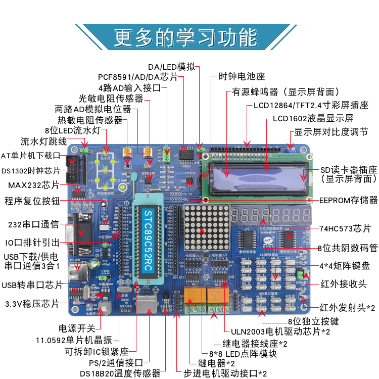 51单片机开发板STC89C52RC实验板HJ-C52学习板箱可升级AVR/STM32