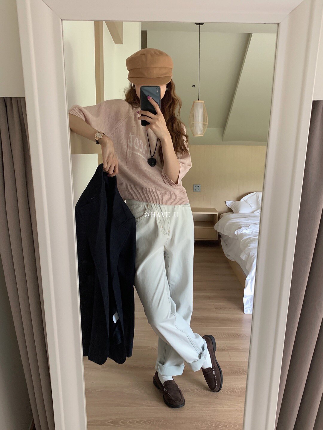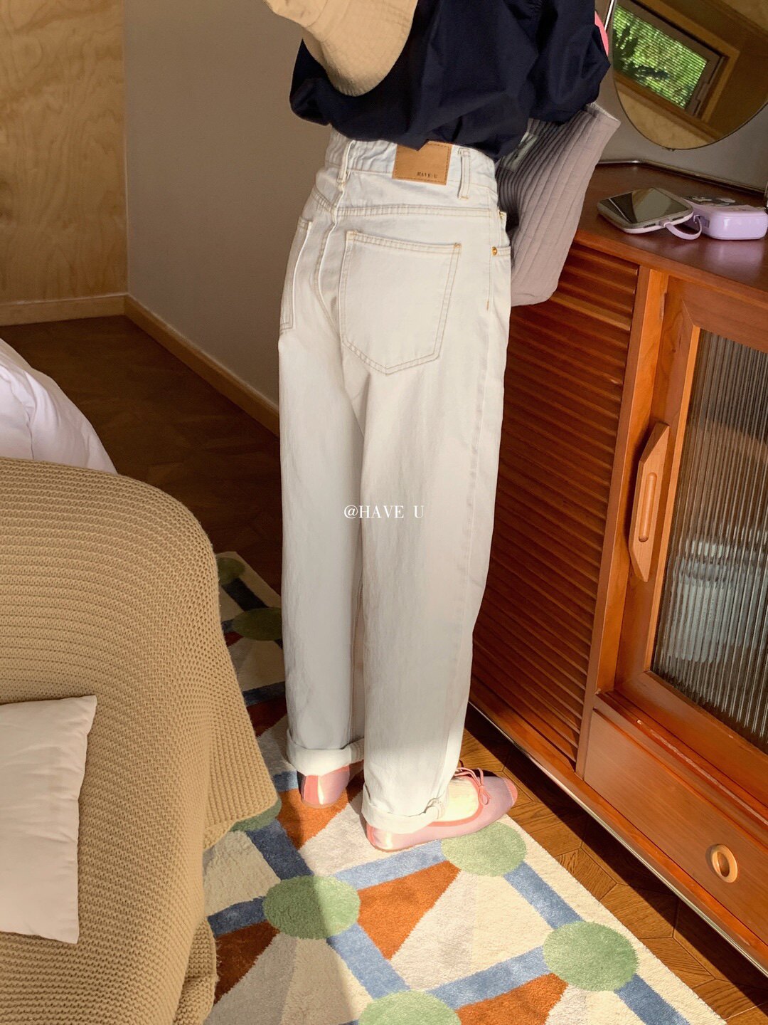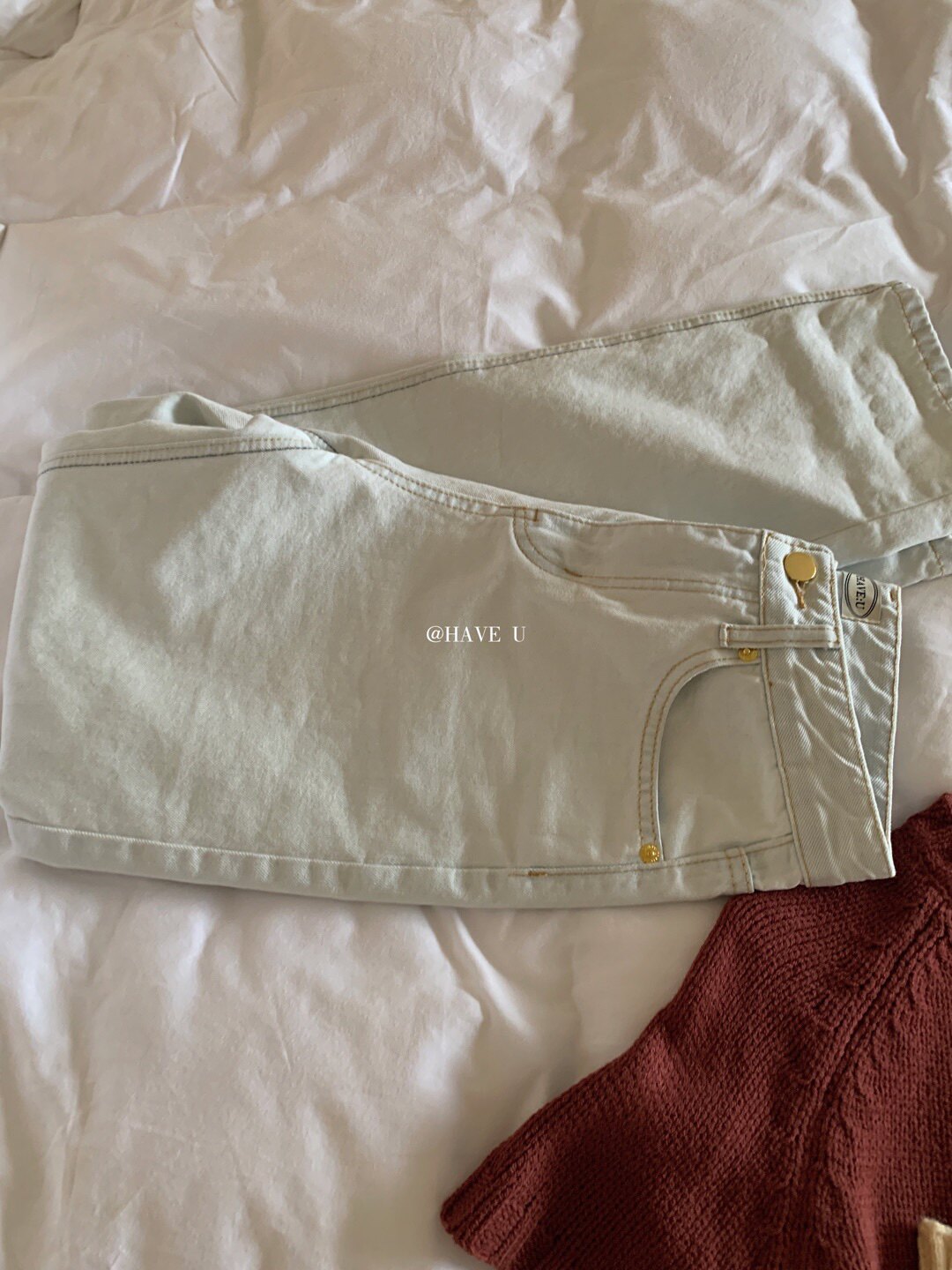 现货Have u海盐浅蓝色牛仔裤 很特别的蓝 显瘦直筒牛仔裤