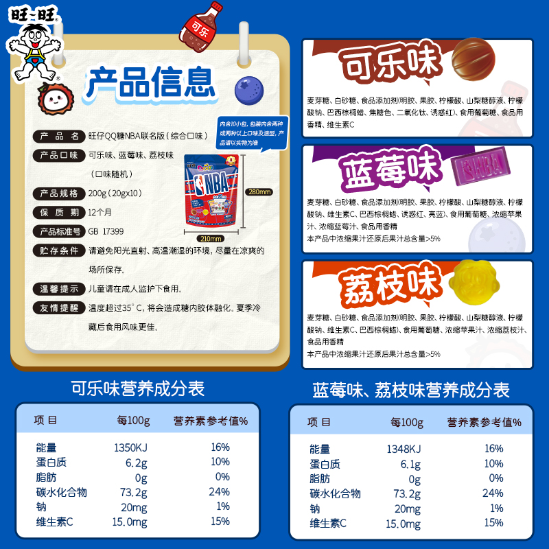 旺仔QQ糖NBA版200g混合口味水果味果汁软糖儿童橡糖皮喜糖果