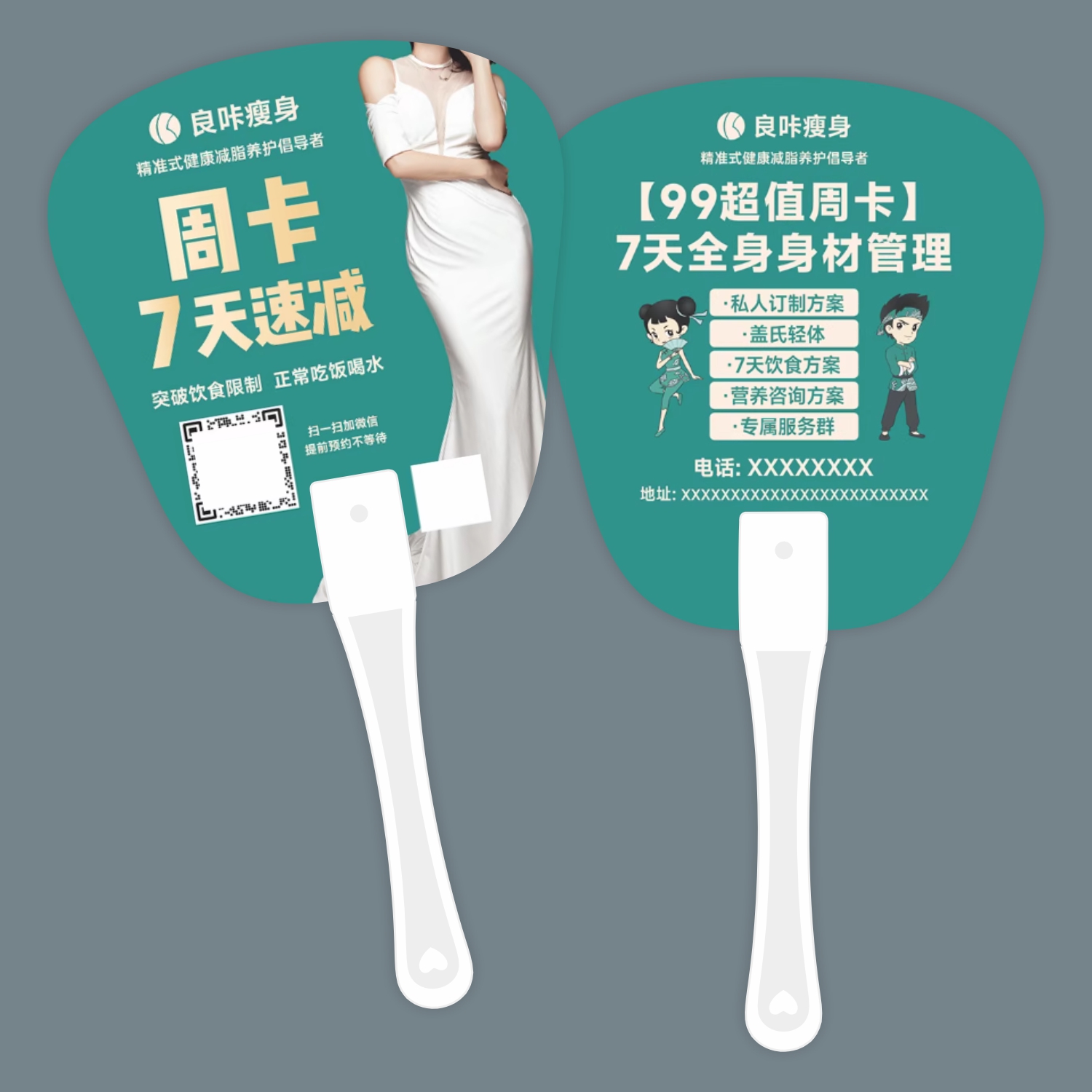 夏季良咔减肥纹绣医美瘦身美发洗发广告扇定制开业周年地推宣传扇