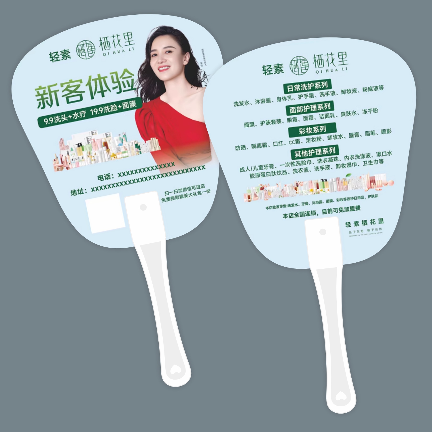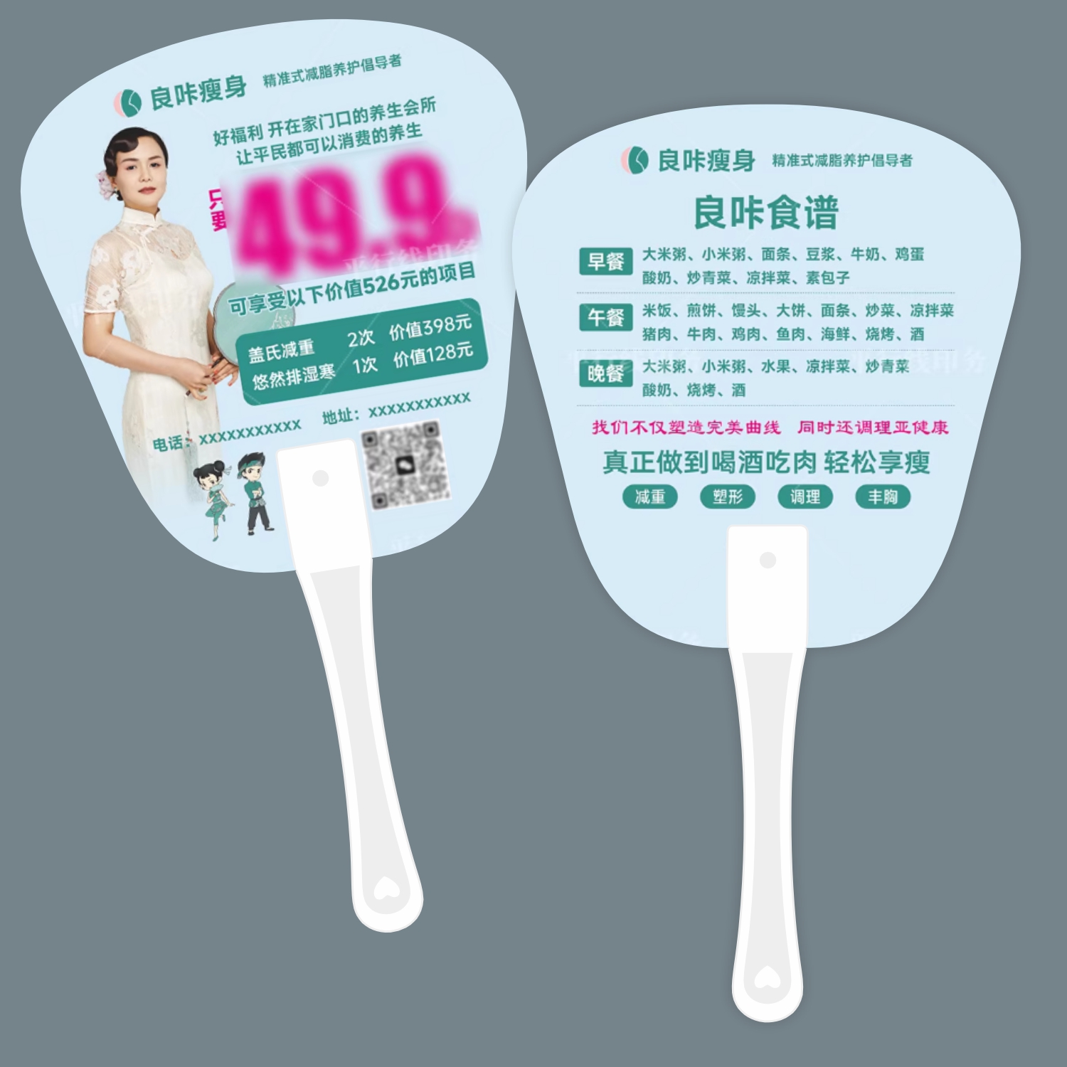 淘宝天猫夏季良咔减肥纹绣医美瘦身美发洗发广告扇定制开业周年地推宣传扇优惠券折扣价格–彩云间