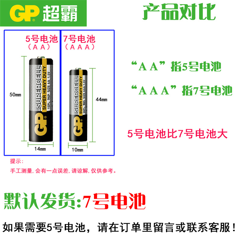 您的位置: GP超霸7号电池5号碳性电池AAA无汞环保1.5V五号七号LR03玩具电视空调遥控器电池