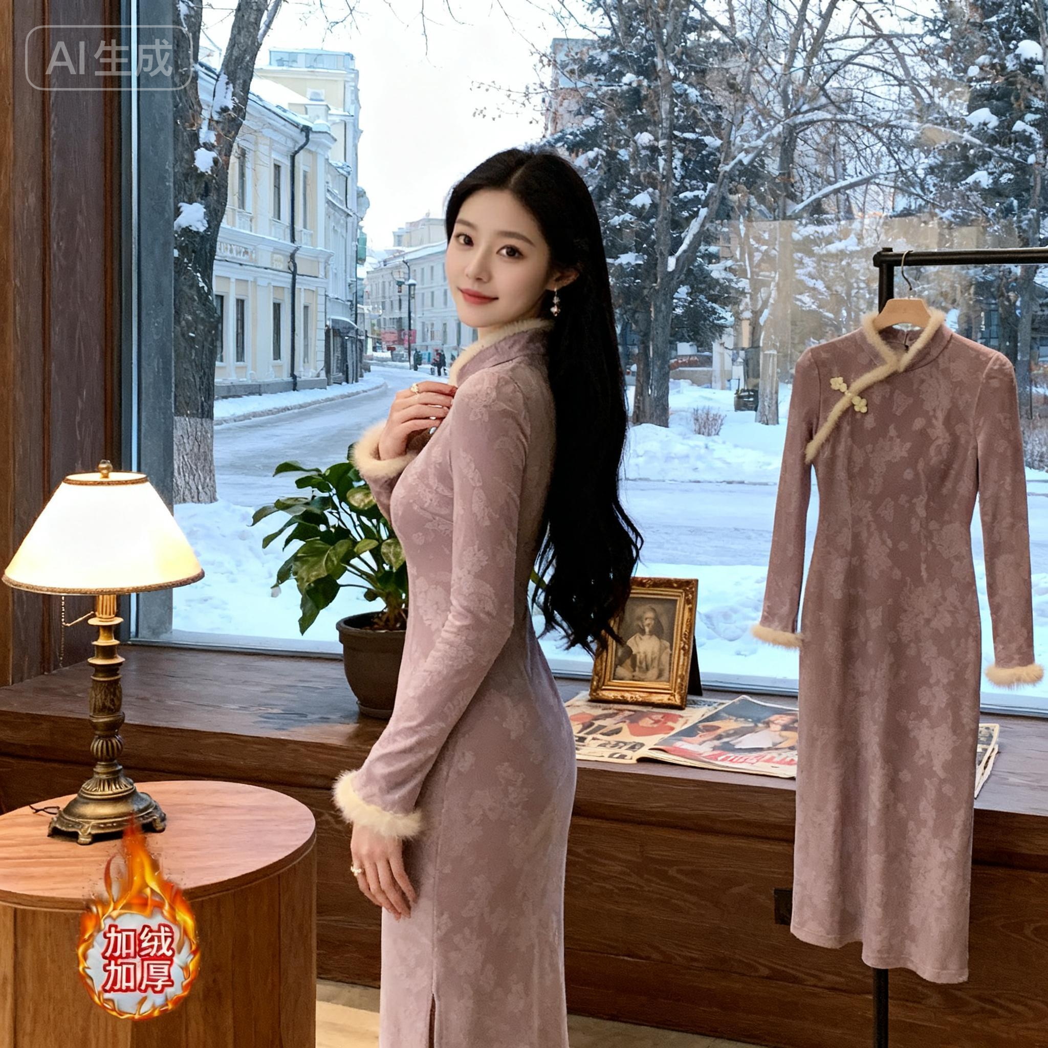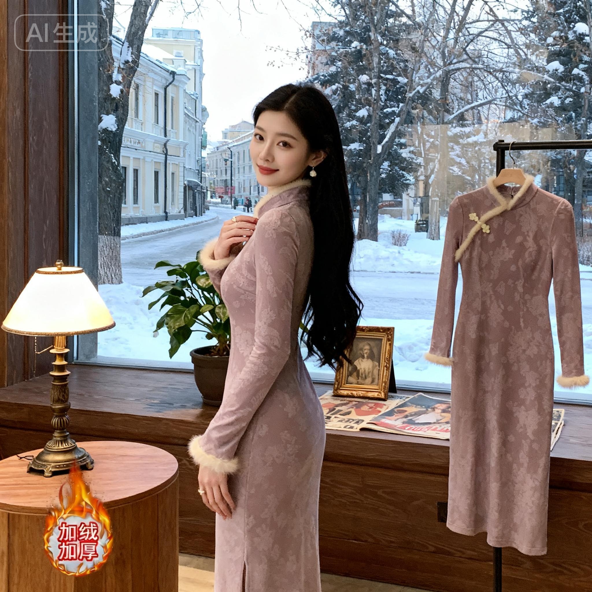 【紫琉璃-加绒】潇夫人自制新中式国风改良紫旗袍女长袖修身连衣�