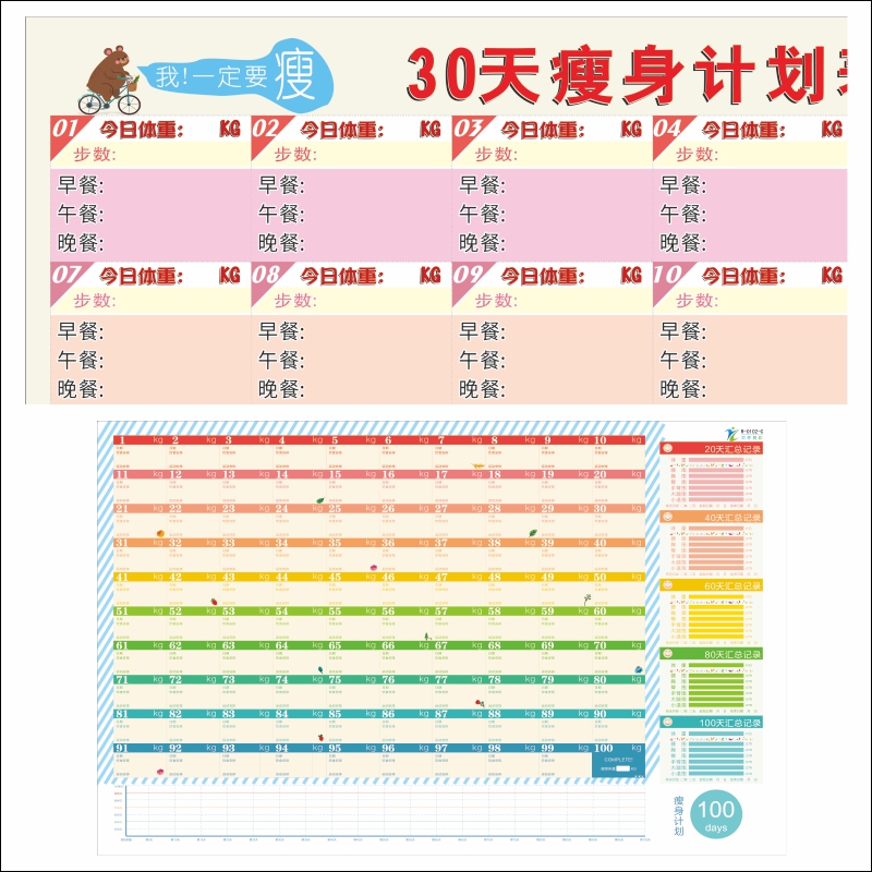 减肥计划表体重自律打卡记录表30天减肥计划表31天瘦身100天减肥