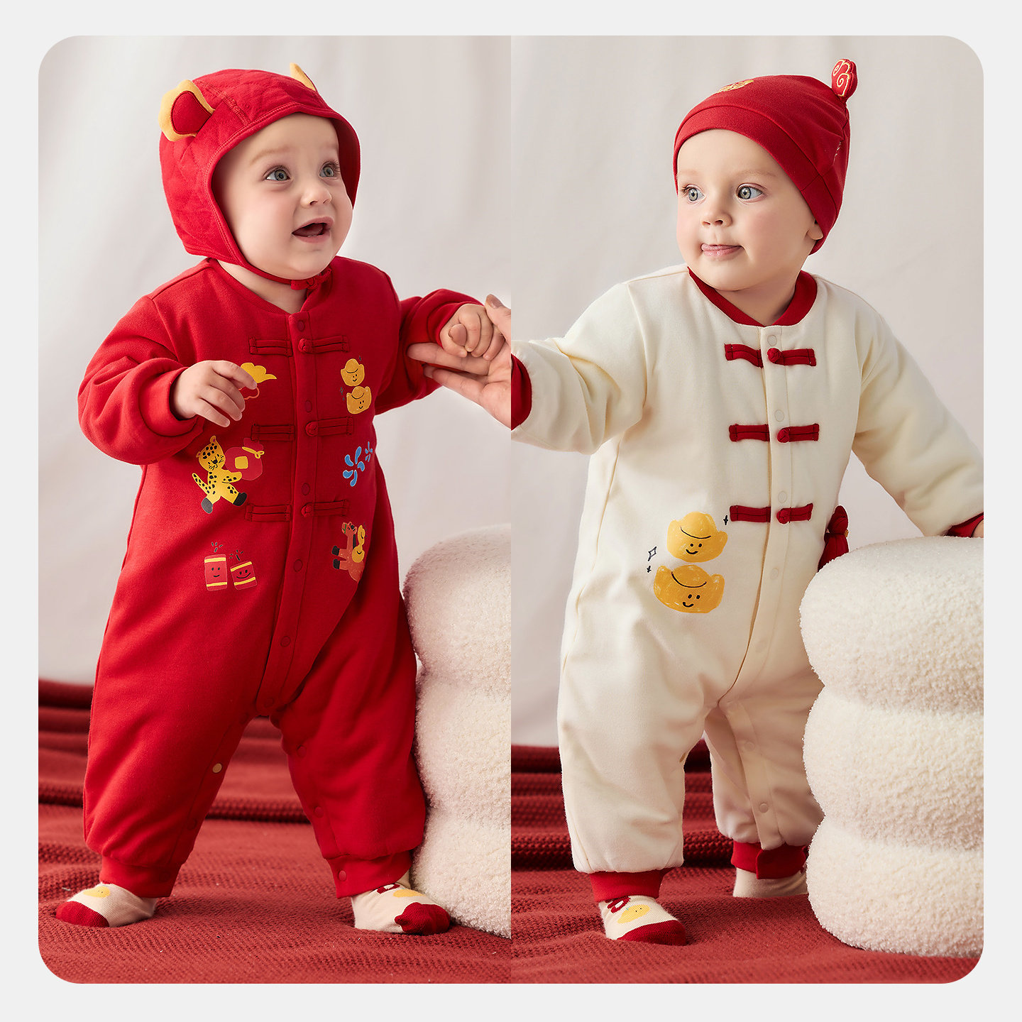 迷你巴拉巴拉婴儿衣服宝宝夹棉,新中式连体衣新年红色爬服百日周岁