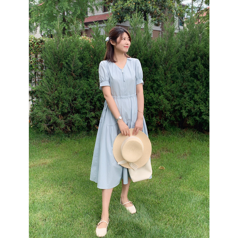 紫璐莱通勤日记~气质V领抽绳收腰短袖工装风通勤中长款连衣裙935X