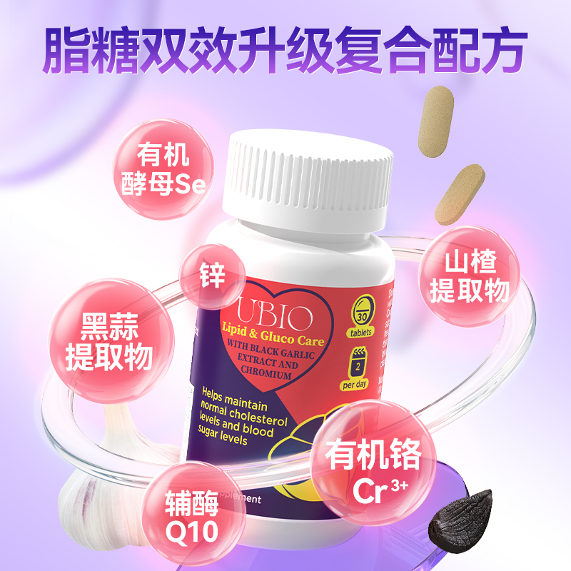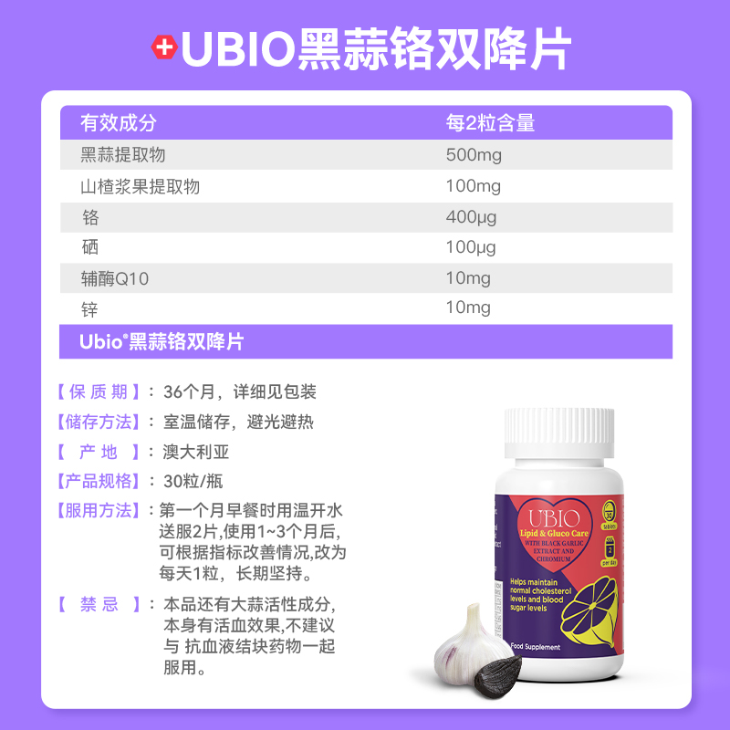 UBIO优碧欧黑蒜铬片双降片血脂高血糖平衡片控糖片三高保健品30粒