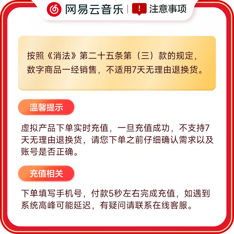 【旗舰店】网易云音乐黑胶VIP会员 年卡月卡周卡填手机号自值动充
