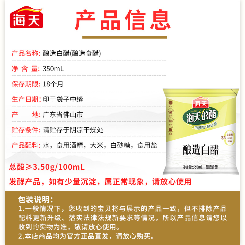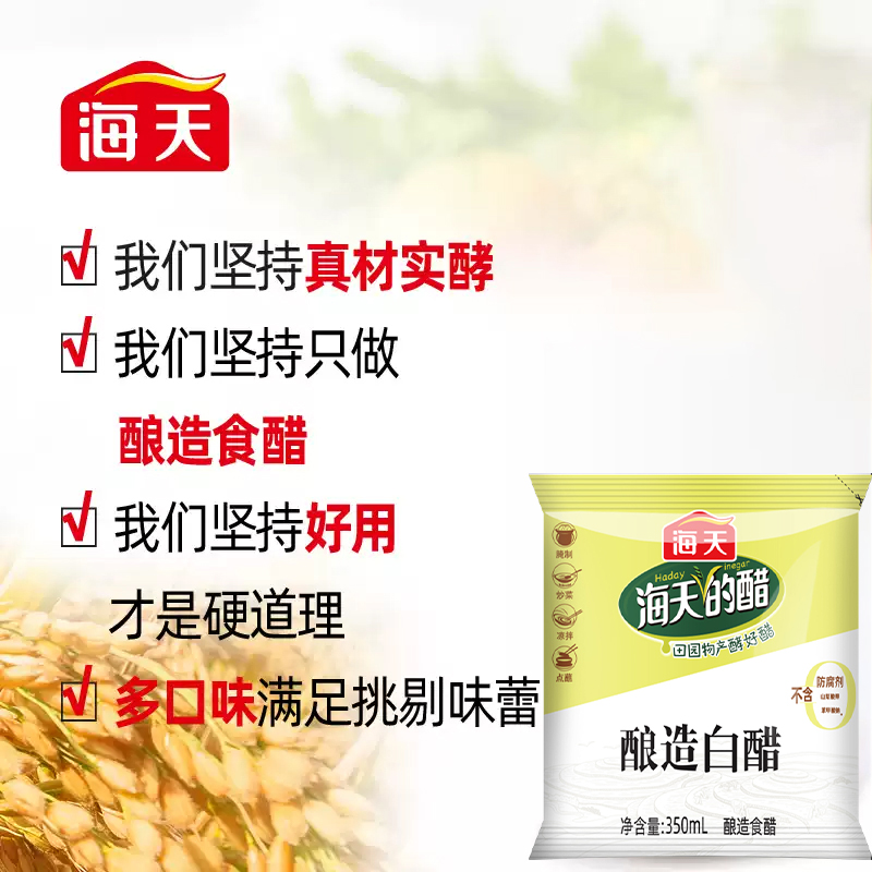 您的位置: 海天酿造醋350ml袋装醋家用面食饺子点蘸腌制泡菜食用醋正品白醋