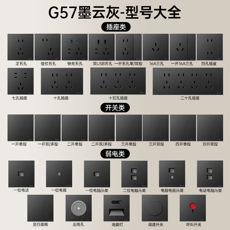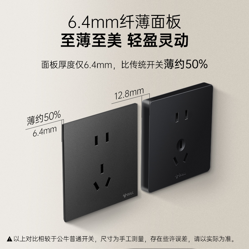 您的位置: 公牛蝶翼超薄开关插座86型面板16A五孔10a暗装家用G57哑光墨云灰