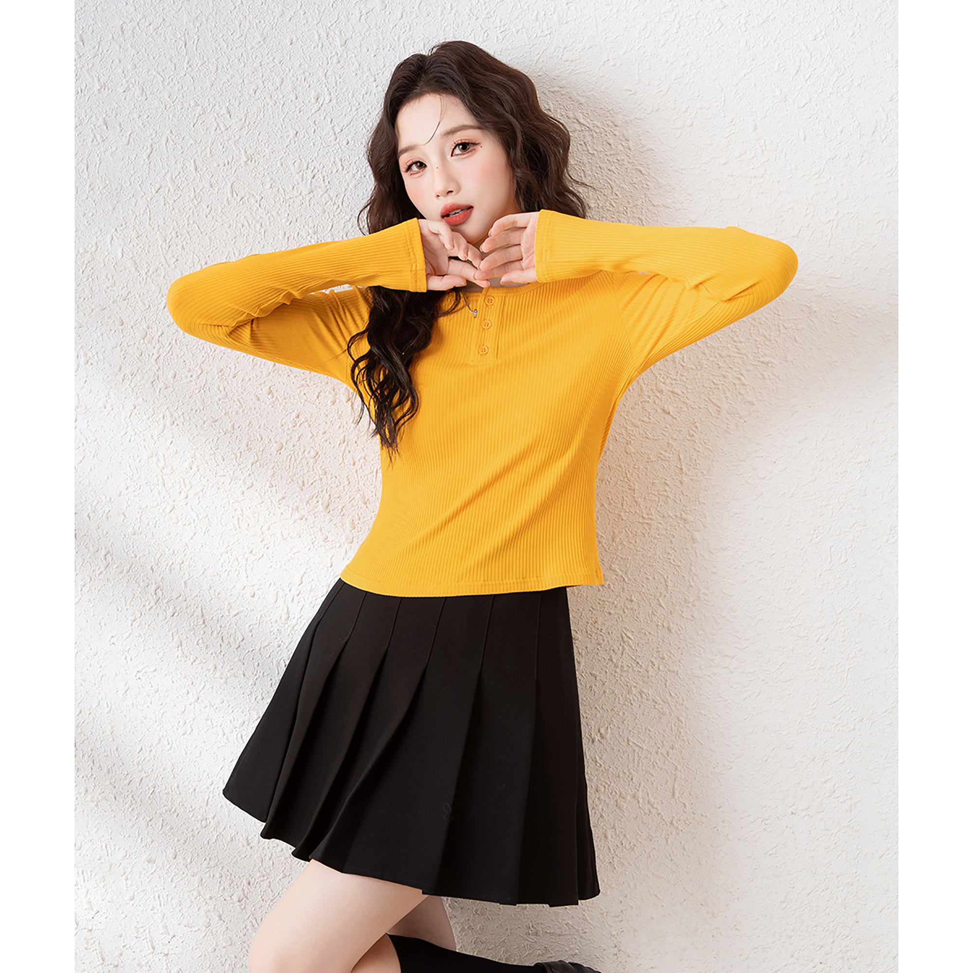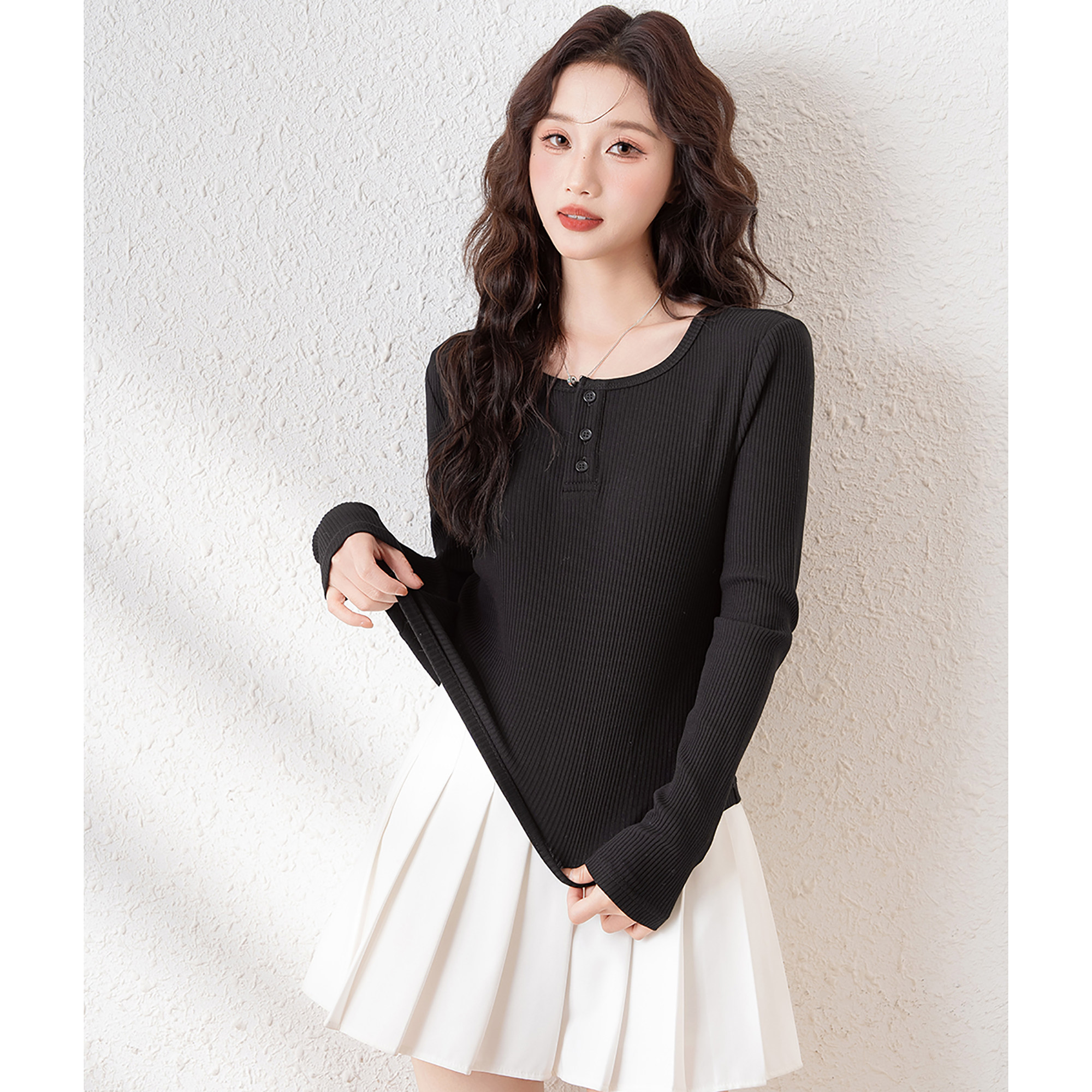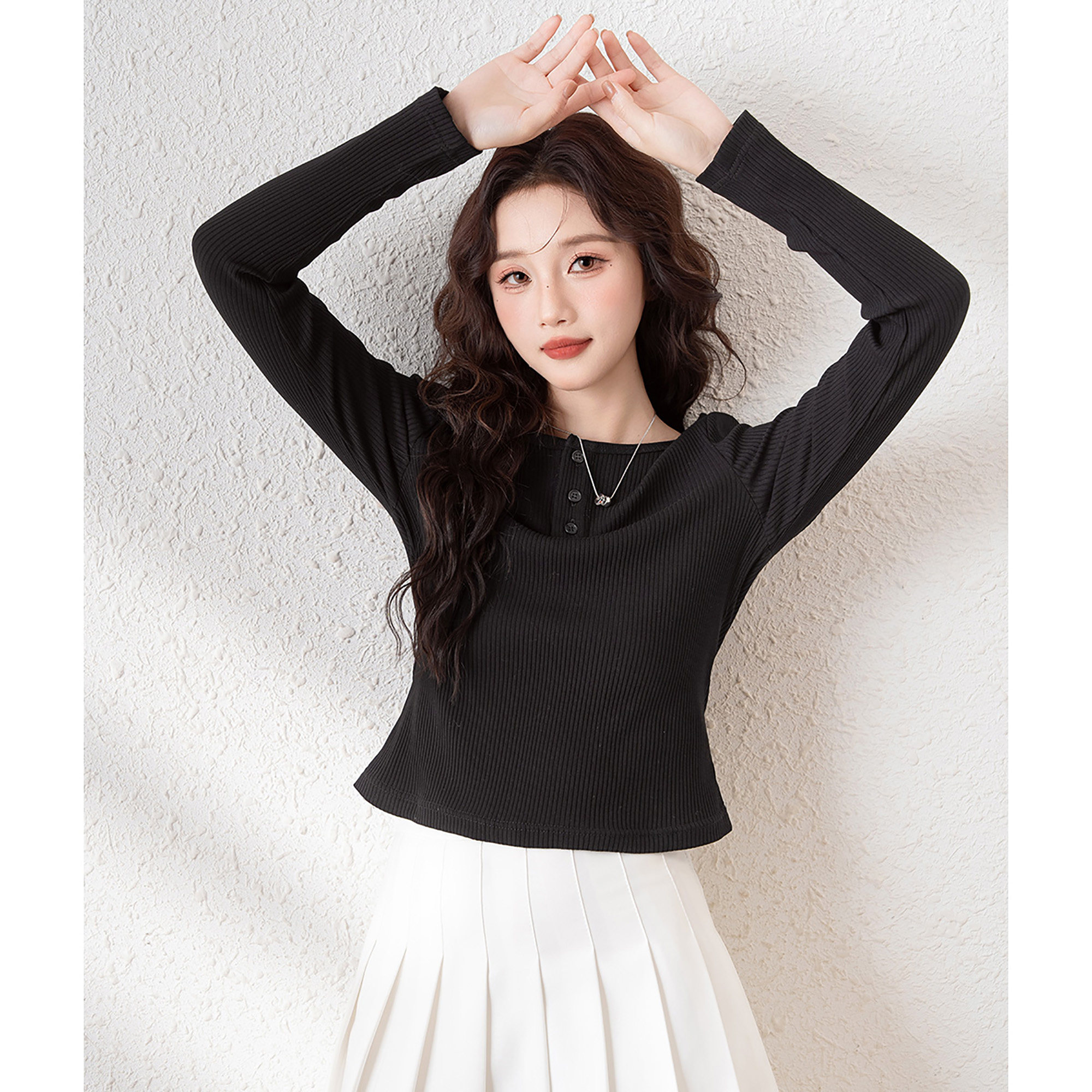 您的位置: 唐狮打底衫新款春季圆领门襟坑条内搭打底衫女黑色小众短款上衣