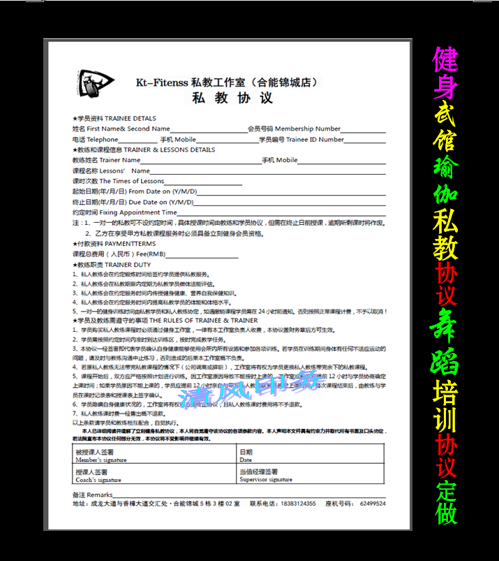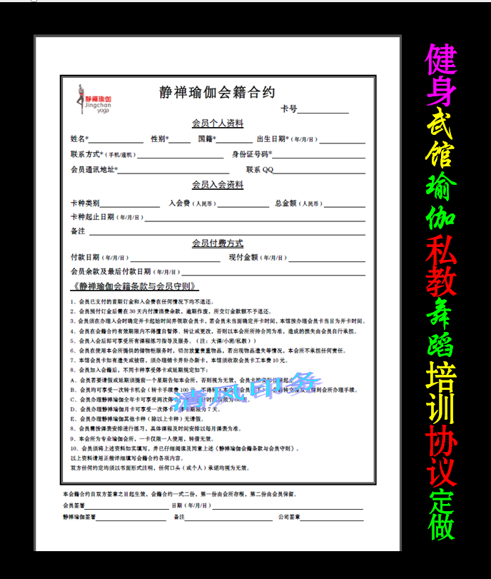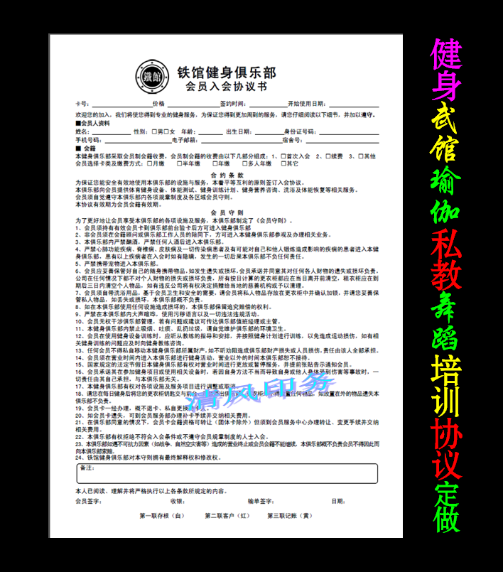 健身会所协议私教协议入会协议瑜伽合同减肥舞蹈武馆协议收据定做