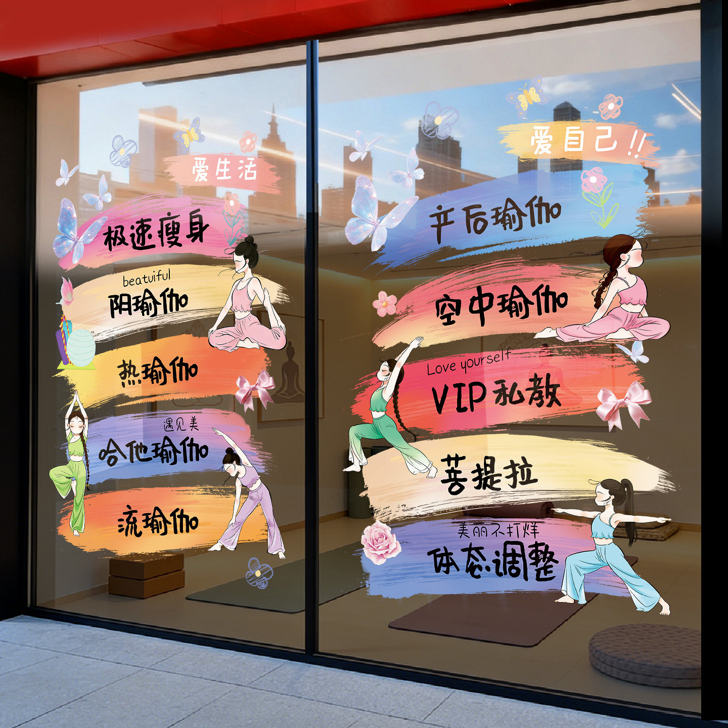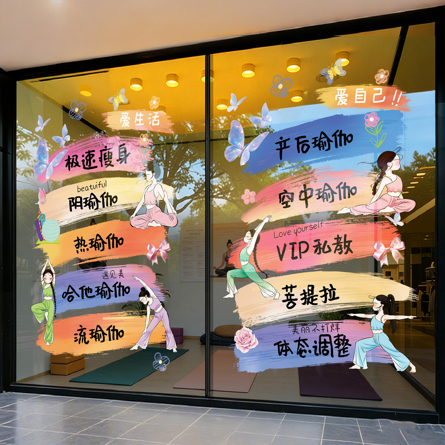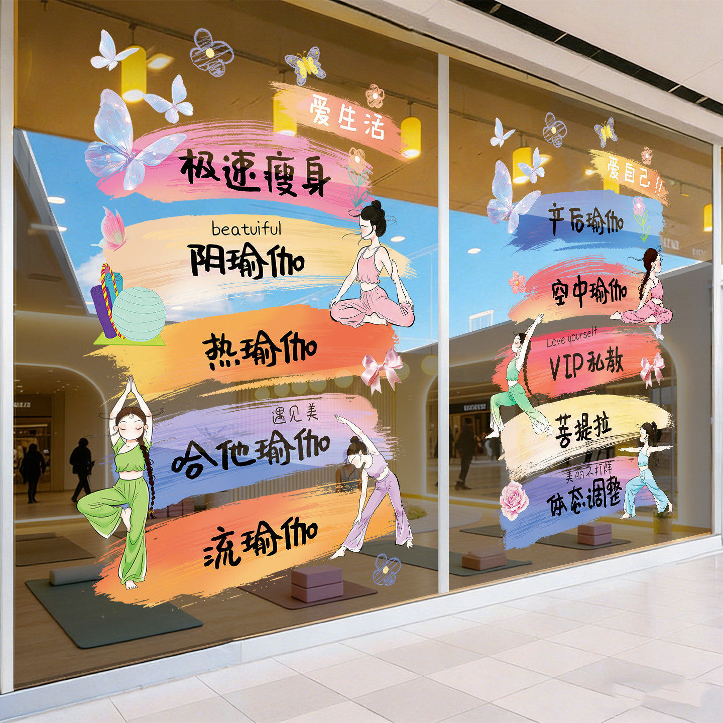 淘宝天猫普拉提瑜伽馆玻璃门贴纸高级感减肥瘦身店窗贴项目广告防撞静电贴优惠券折扣价格–彩云间