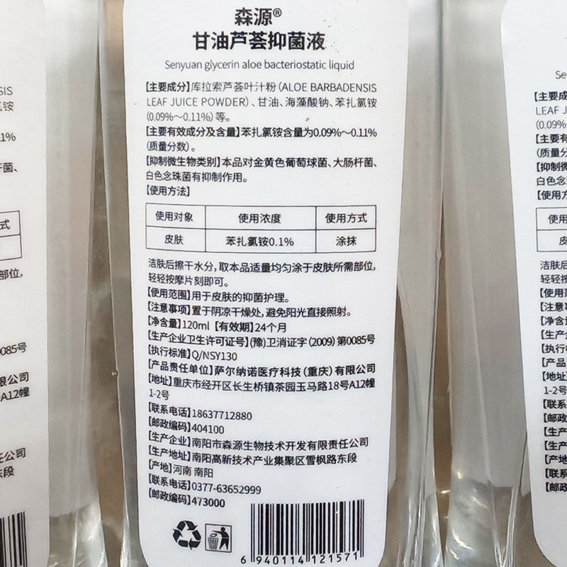 2送1森源护肤甘油芦荟抑菌液润肤保湿手干燥120ml/瓶新好日期3送2