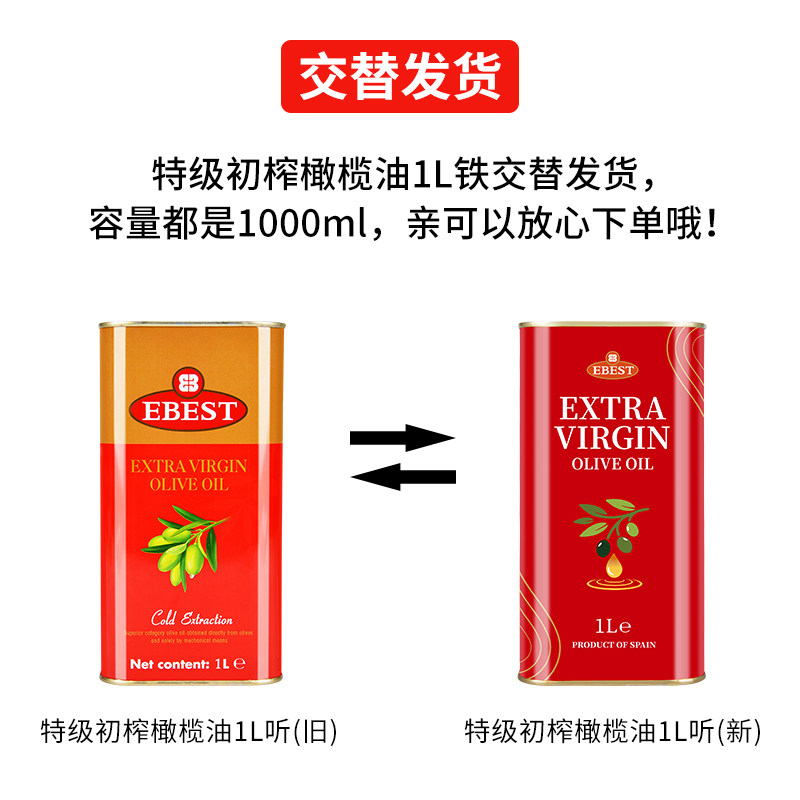 【原装进口】易贝斯特西班牙特级初榨橄榄食用油1L铁*2听凉拌炒菜