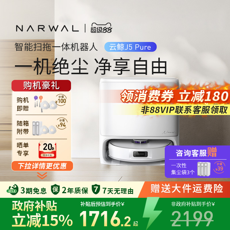 【国补15%】云鲸J5Pure智能扫地机器人,下拉详情叠淘金币+国补,到手1821.16
