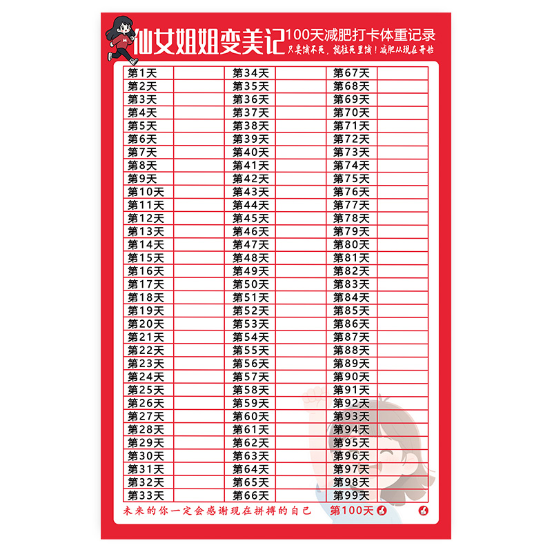 您的位置: 减肥打卡墙贴100天自律减肥计划表健身锻炼减肥瘦身百日计划表