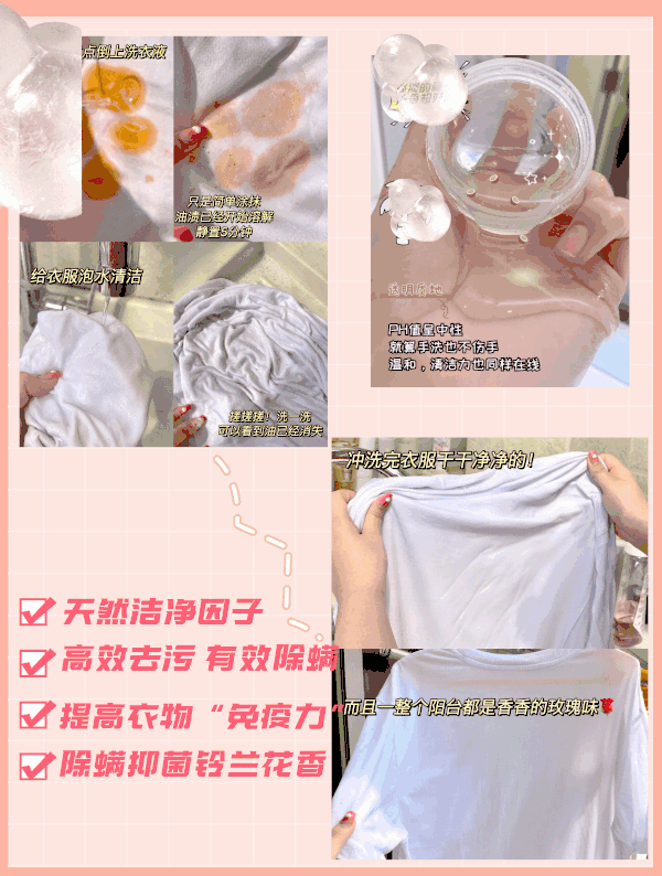 这款洗洗衣液采用抗污渍再沉淀技术,能够将污渍包裹住,防止沾附,它还有护色增艳功能哦~真正做到防止衣服越洗越旧,让衣服能持久亮丽如新~